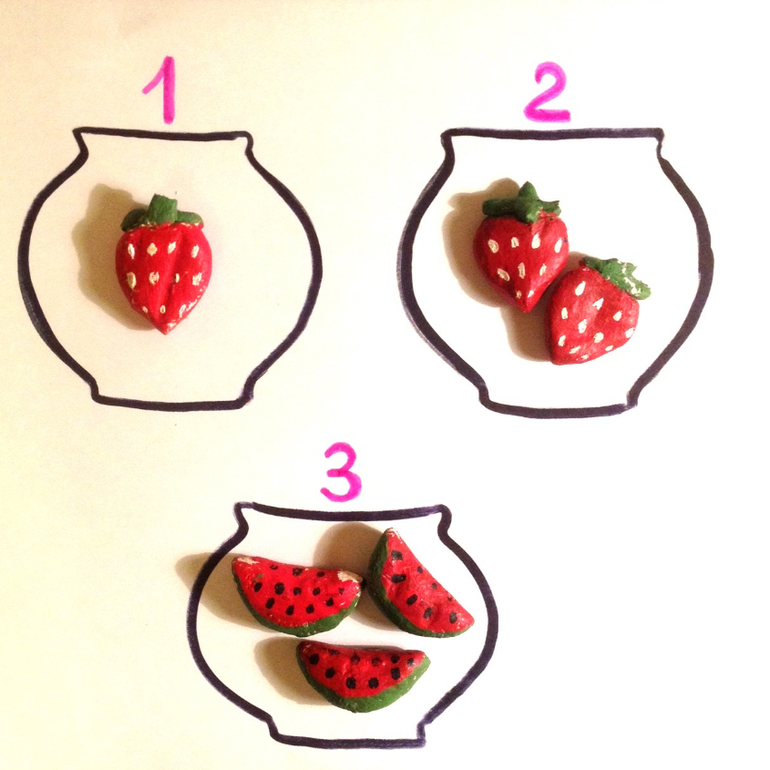 Раскладываем клубнички в баночки с цифрами (справился сам)