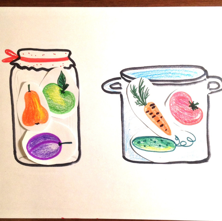 Нужно положить овощи в кастрюлю, а фрукты в банку.