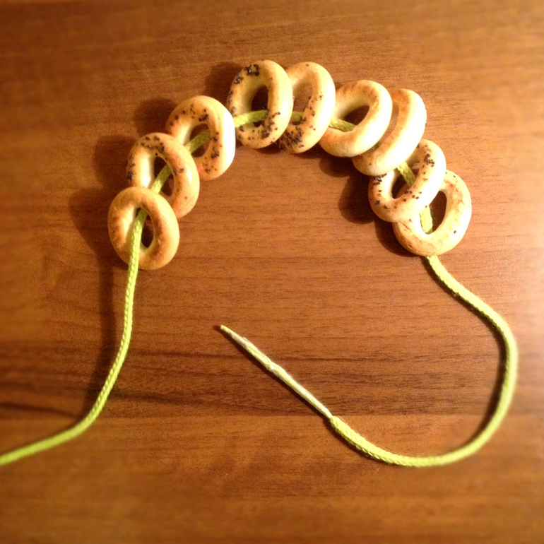 Надеваем бараночки на шнурок (почти все съели после задания)