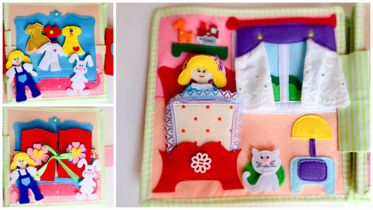 Получилось 12 страничек и более 50 съемных элементов. Все, что окружает нас в повседневной жизни собрано в домике: спальня, гардероб, кухня, ванная, игровая площадка, огородик и даже так любимые девчонками элементы больнички