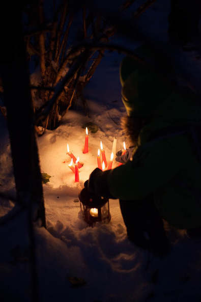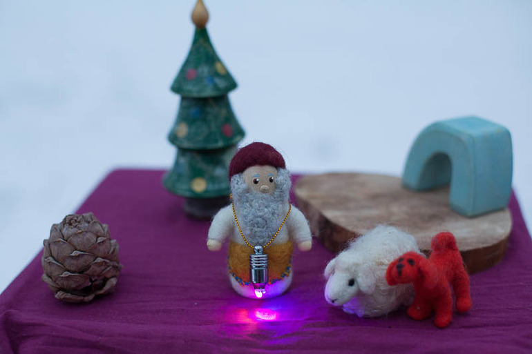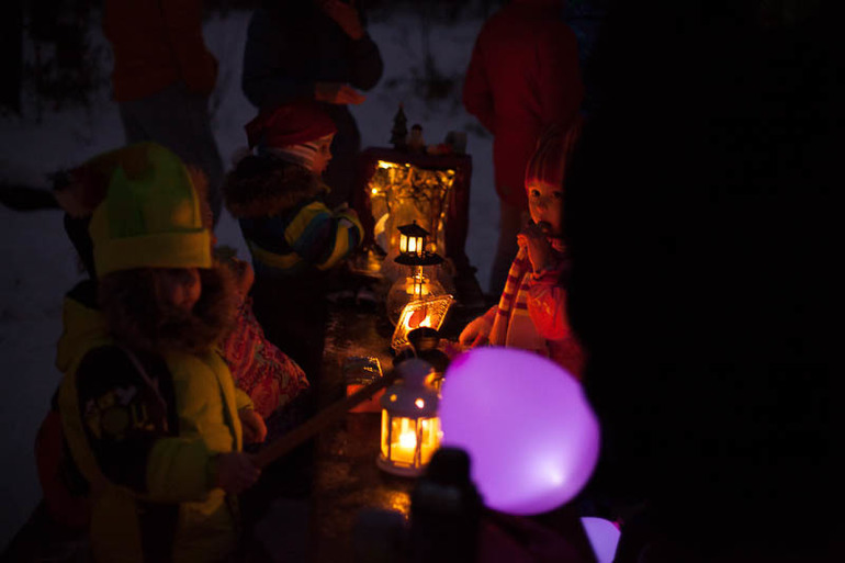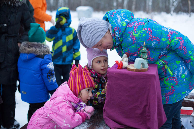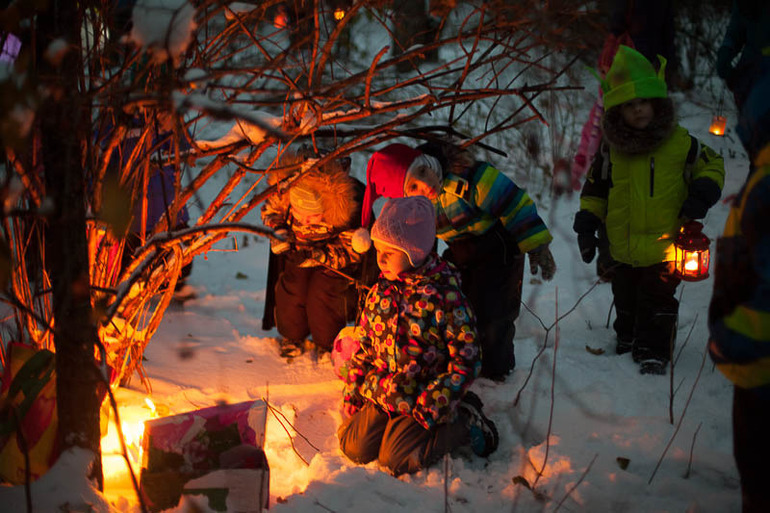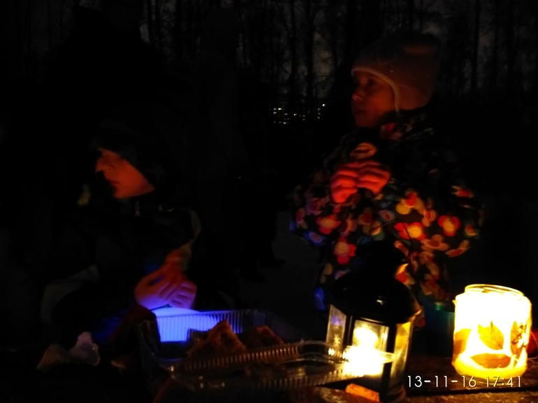 Было хождение в сумерках с фонариками от одного светящегося маячка к другому и как неожиданное чудо-клад .Всем достался подарок-мешочек с настоящим самоцветом, теплым шерстяным гномиком и сладостями.