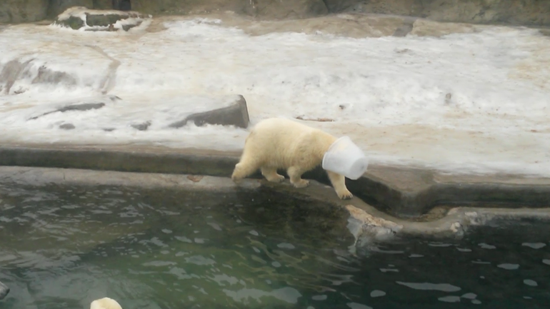 У медведей борьба за пластиковое ведро.