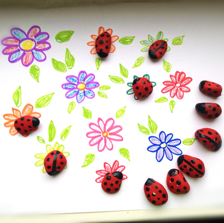 Сегодня мы сразу после завтрака сели позаниматься. Для начала нужно размять пальчики: вынимали из баночки божьих коровок и раскладывали их по цветочкам.