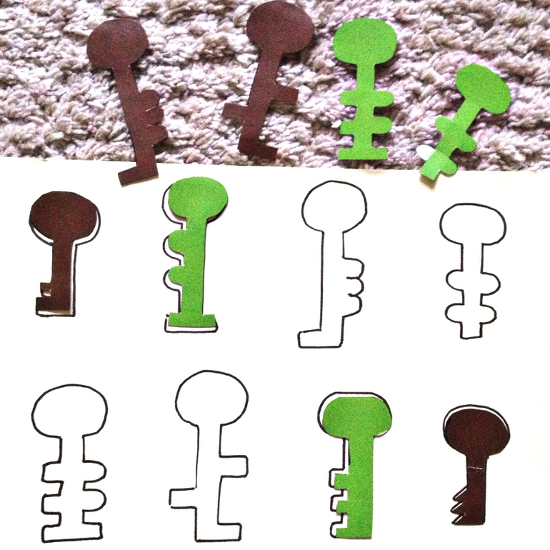 Самодельная игра: разложить по контурам ключики. И Тима, и Ваня периодически ее достают и играют. Почему-то им нравится.
