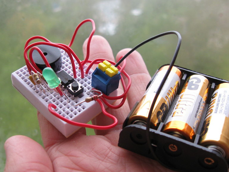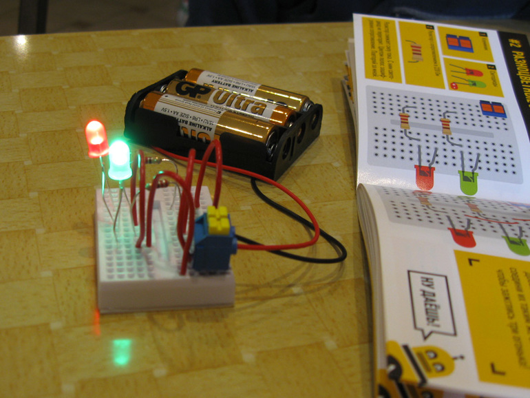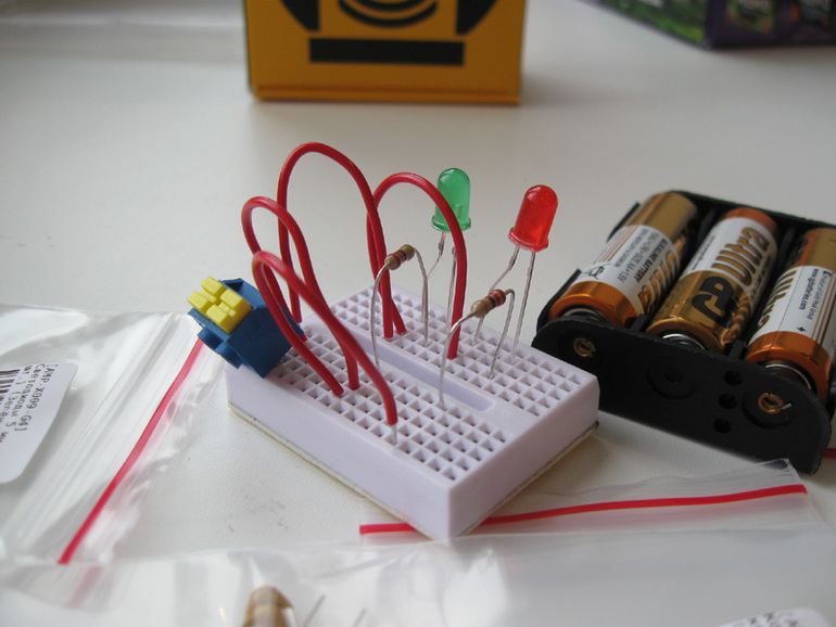 Зато теперь знаем, что нельзя путать плюс и минус, и что вообще нельзя просто так произвольно втыкать электронные компоненты в макетную плату - можно не только КЗ устроить (хоть и не опасное), но и спалить какой-нибудь светодиод, например. К ответственности приучает, в общем. Перед подсоединением батарейки надо убедиться, что схема собрана правильно (а если схема своя - спросить у папы, верно ли придумано).