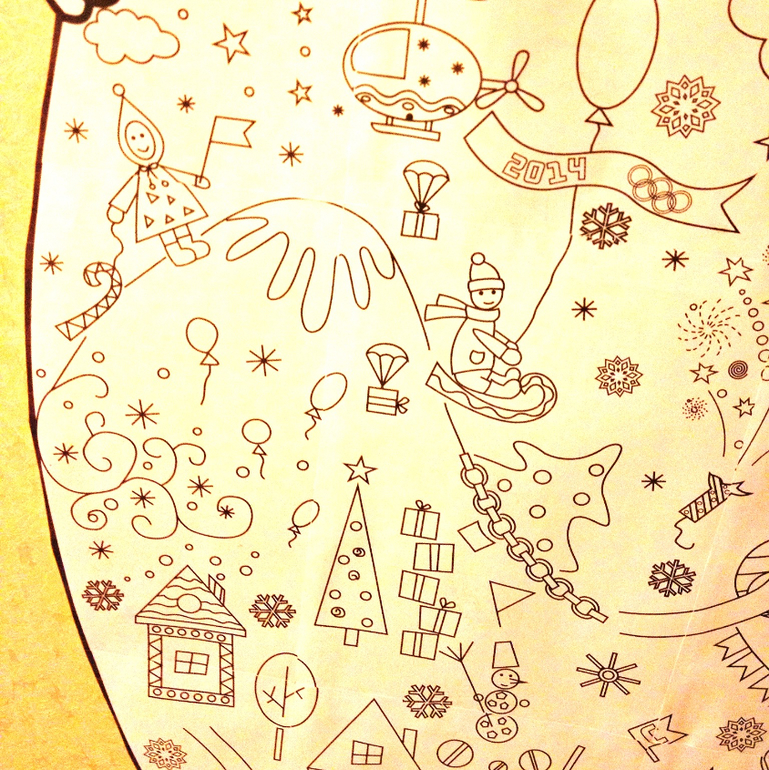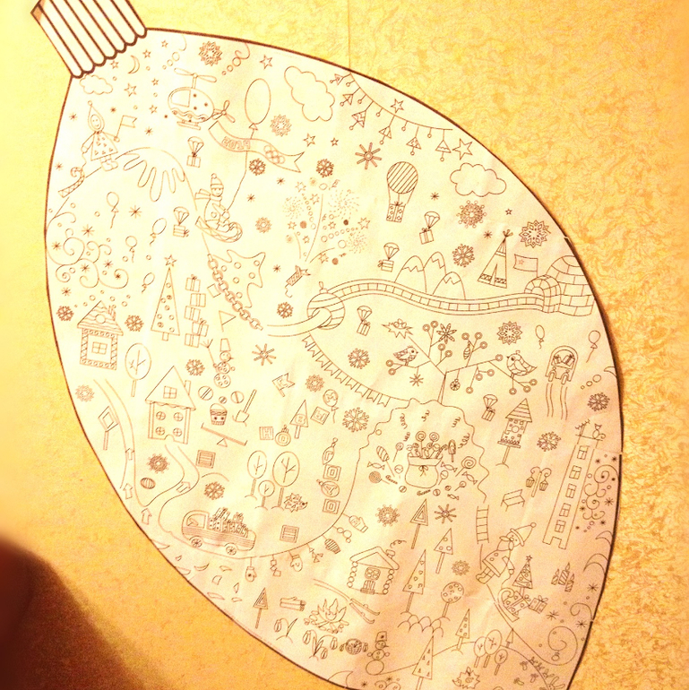 По нашей традиции я повесила на стену гигантскую раскраску. В этом году елочный шар. В прошлом году была елочка, она чудесная, всем понравилась, но я решила не повторяться.