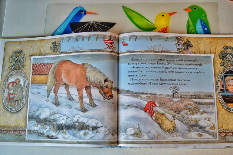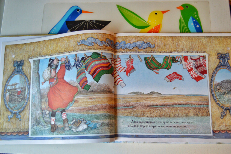 "Шапку" Даша любит больше, чем "Рукавичку". Здесь сюжет уже позакручистей)) У меня иллюстрации и сам стиль оформления ассоциируются с английской деревней. Даше нравится разглядывать книгу, смотреть чем занята девочка в момент текущих событий, сколько вещиц осталось на верёвке.