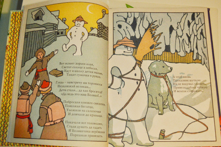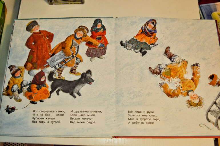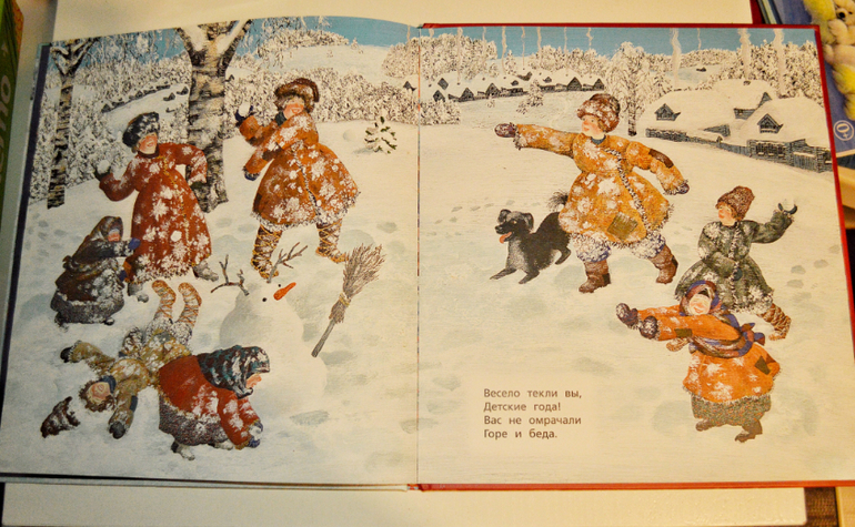 И третий заключительный мой любимый иллюстратор-Михаил Бычков. Эта книга идеальна для подарка. Она невероятно красивая. Всего одно стихотворение смогло "создать"такой шедевр! Вот смотришь и вспоминаешь своё детство, рассказываешь зачем платки на рот повязывали, как приходила с комками снега на рейтузах и ставила оттаивать возле входа)) Сейчас в эпоху Рейм, Керри и прочих космических костюмов детям не понять всю прелесть настоящих колючих шерстяных носков, валенок и шапок набекрень))