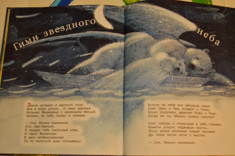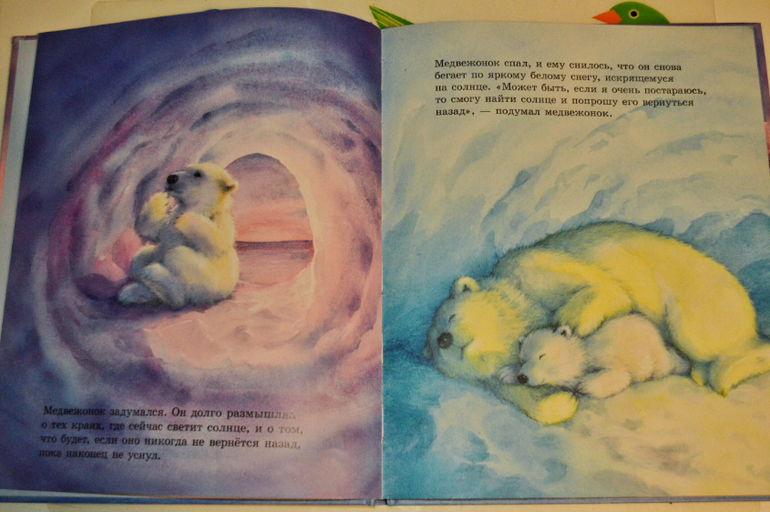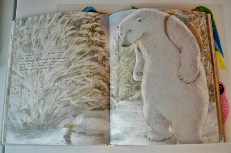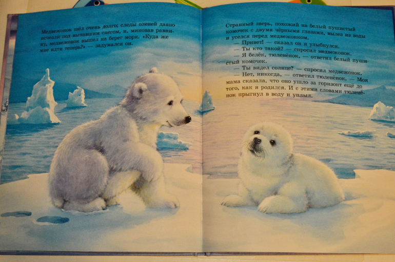Ну а это-книга особая. Буйство цвета! Все оттенки синего, фиолетового, зеленого! Мы много раз разыгрывали эту трогательную историю с деревяшками. Дэрья так любит картинку, где медведица обнимает своего малыша и засыпает)) А какой там кит! А белёк!!