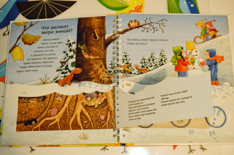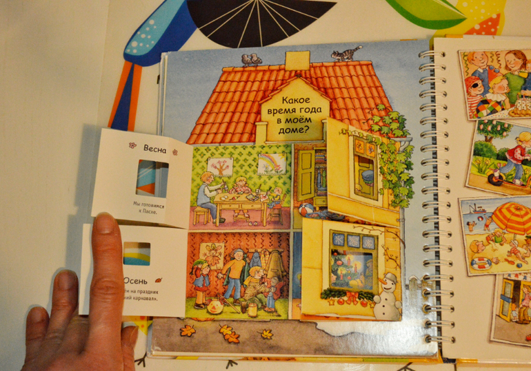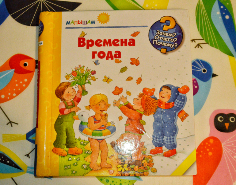 Подошли к энциклопедиям и гляделкам. Занимательная серия с окошками "Зачем? Отчего? Почему?" Отличные первые энциклопедии для детей. Текст понятен, и ребёнок может читать ее самостоятельно. Картинки и окошки заинтересовывают малыша. Эта книга о временах года кроме разворотов с ними, есть ещё часы смены месяцев, страницу с детками, которых нужно одеть по погоде и домик с окошками-временами года. Даше нравится вся эта серия.