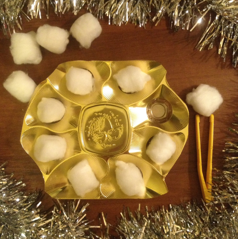 Разложить снежки (ватные шарики) по ячейкам с помощью пинцета.