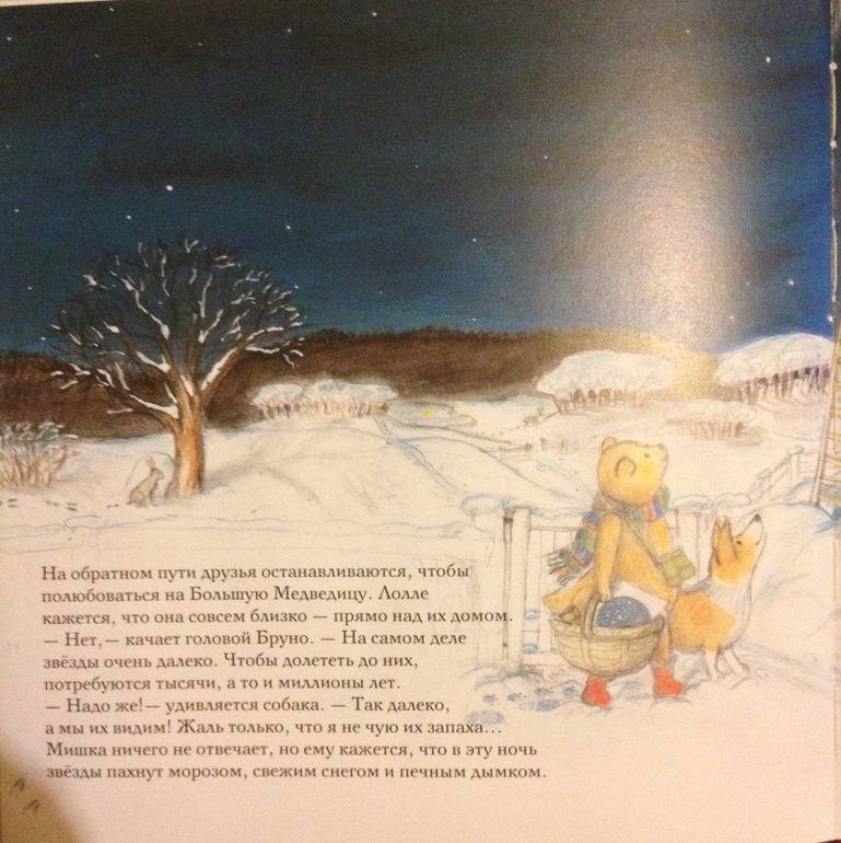 В книжке описан один день медвежонка и его собаки. Они ищут следы, смотрят на звезды, ужинают оладьями с черничным вареньем. Все очень уютно, спокойно и по-зимнему. Короче моя тема.