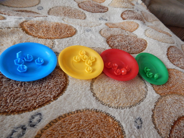 Раскладывали детальки мозаики по тарелочкам определенного цвета, потом считали кол-во в каждой тарелке.