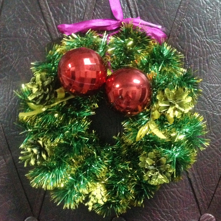 Рождественский венок сделали тоже сами. На картонное кольцо намотали зеленую мишуру, украсили шишками и шариками.
