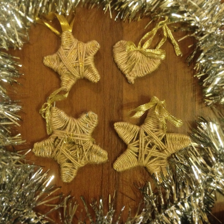 Сделали вот такие звездочки и сердечки, на проволоку намотали веревочку.