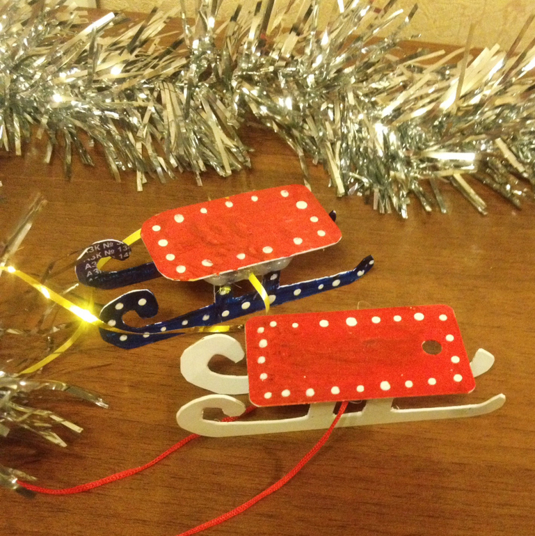 Саночки из ненужных пластиковых карт. Вырезала детали и склеила клеевым пистолетом.