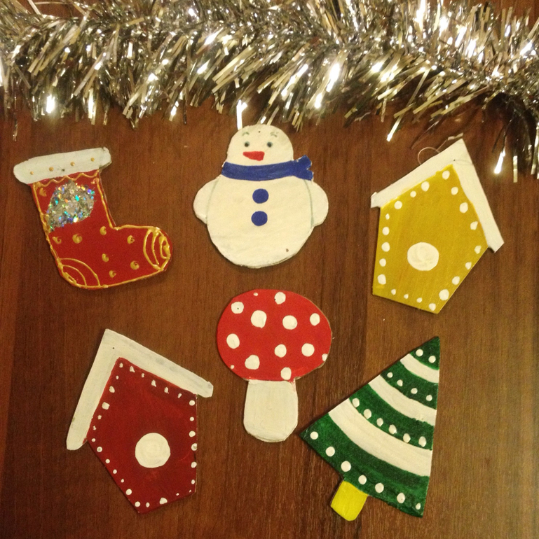 Покажу некоторые наши новогодние украшения, которые мы сделали вместе с моими детишками. На первом фото картонные фигурки, из них хорошо делать гирлянду.