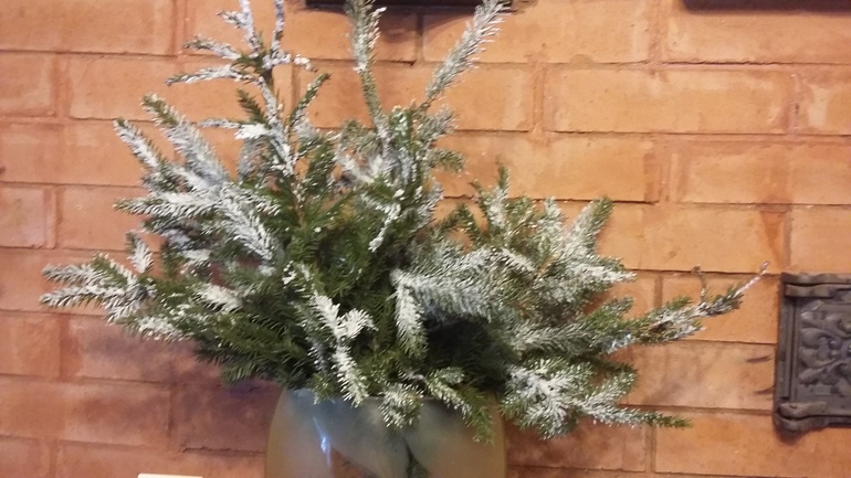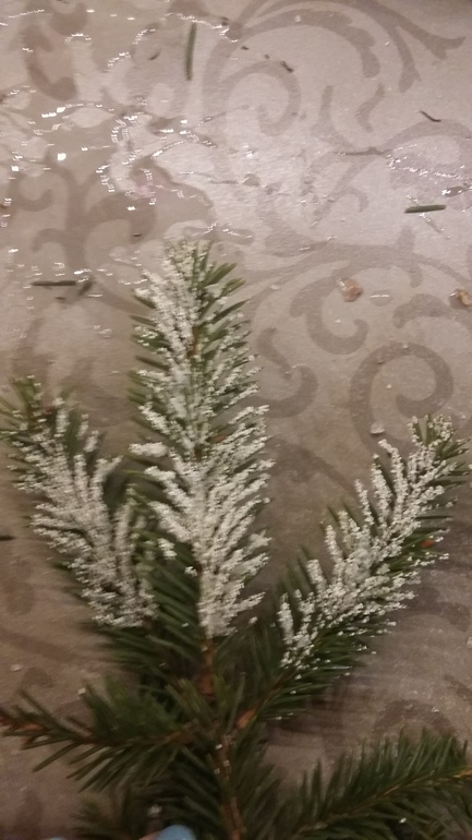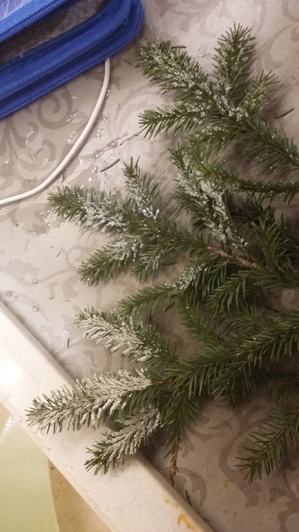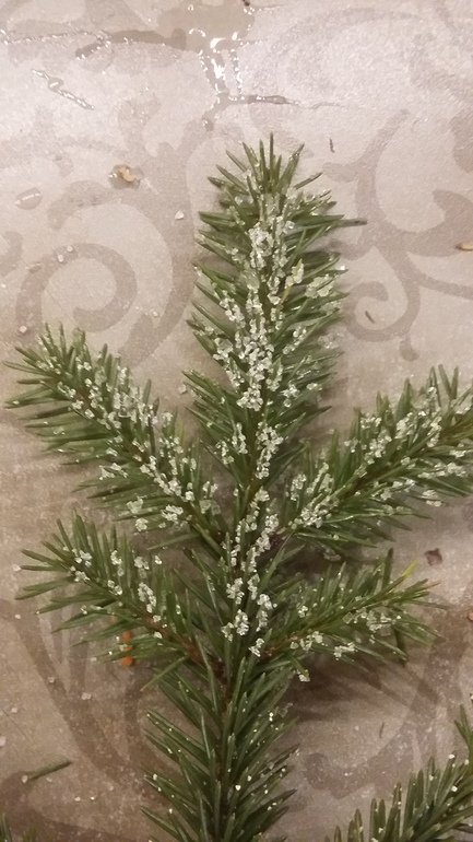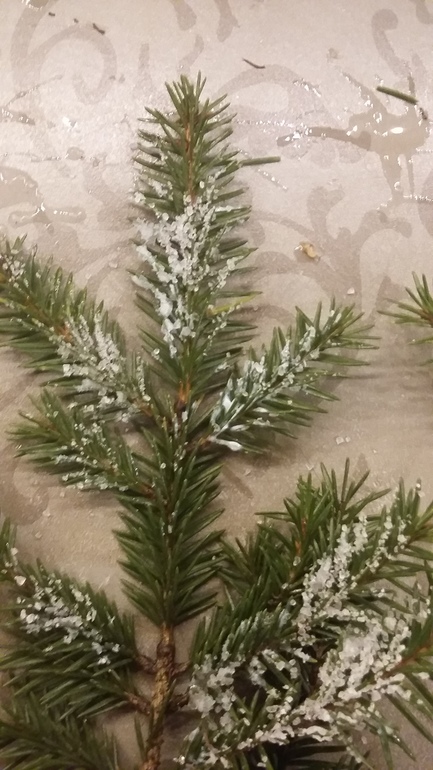 Готовимся с сыном к НГ, и хочу с ним задекорировать еловые ветки, чтобы они выглядели заснеженными. В интернете нашла про долгое выращивание кристаллов, которое нам не подходит (сыну всего 2,8, он и слово то такое произносит с трудом). Также нашла вариант "обмакнуть в воду, затем в сахар", это нам уже ближе. Сегодня в рамках репитиции попробовала воду с сахаром (на фото это верхний вариант), и не сильно впечатлилась. Потом вспомнила про любимые сыном "волшебные картинки" (я рисую клеем на бумаге рисунок, а он сверху рассыпает соль или мелкую крупу). Попробовала на елках - кистью нанесла клей ПВА и посыпала солью и манкой (соответственно, средняя и нижняя ветки на фото). соль прикольно посверкивает, а вот манка дает эффект инея, пусть и слегка желтоватого (на контрасте с хвоей желтизна почти незаметна). В итоге смешала соль и манку в одну емкость и ее завтра выдам сыну).