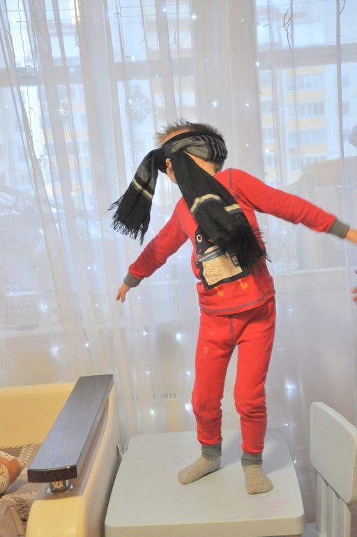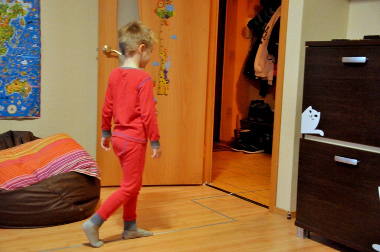 Из цветного скотча, мы сделали ровную линию до кухни, Егор должен был пройти по ней.