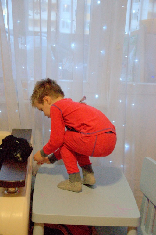 Я подкладывала подушки, чтобы он наступал только на них,папа, держал и помогал Егору передвигаться...