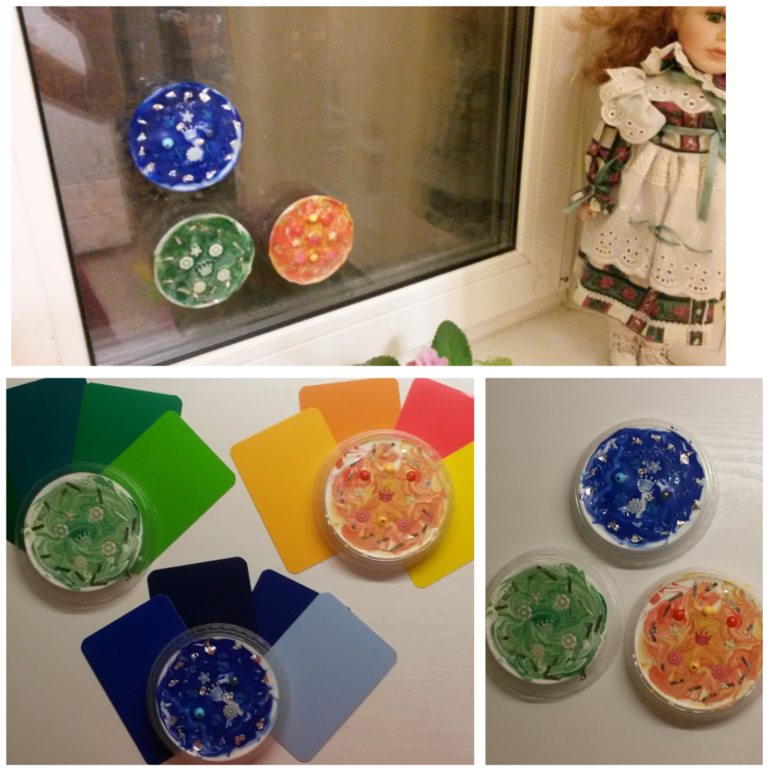 Клей ПВА наливаем на внешнюю сторону крышки от сметаны, главное не жалеть, иначе шедевр получится тонким и может порваться. Опускаем кисточку в краску и начинаем делать разводы. Удовольствие не передать словами! Получаются замечательные мраморные рисунки, один цвет приобретает множество оттенков и переливов. Много краски не нужно, иначе рисунок утратит свою четкость. Украсить можно бусинками, блестками, бисером, в общем, что найдете дома. Самое трудное, ожидание… Когда же все высохнет и что получится? Сушили два дня, за это время придумали название шедеврам «весна, зима и лето». Достали палитру из комплекта "Творчество с пеленок", нашли получившиеся оттенки. После застывания, вытаскиваем шедевр, немного смочив водой, размещаем на окне. Смотрится очень красиво, особенно днем, когда лучи солнца попадают сквозь рисунок.