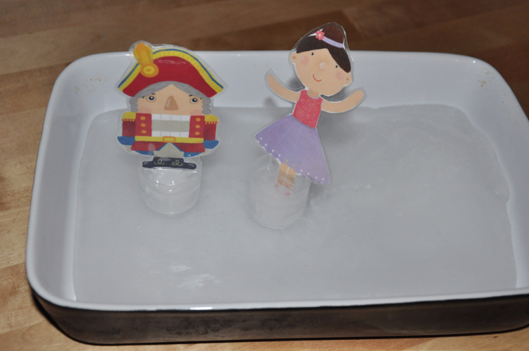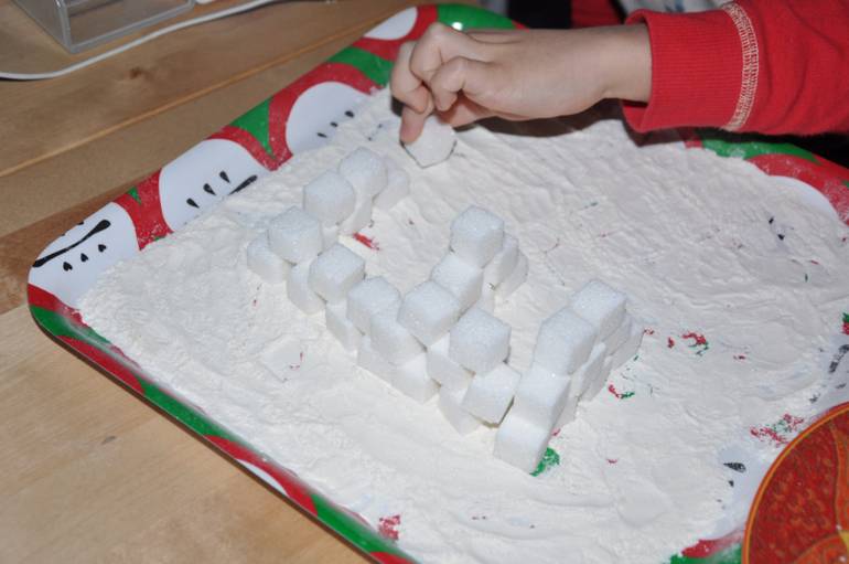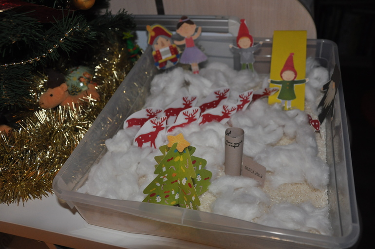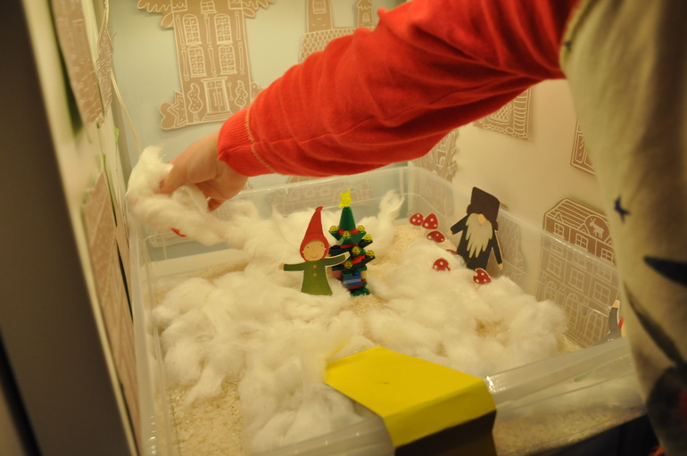 Сам городок (помимо домиков) у нас - это прозрачный контейнер со "снегом" в виде риса и ваты (вариантов для "снега" автор тоже предлагает несколько).