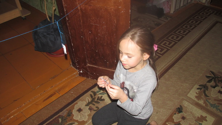 Чтобы их прочитать, надо их срезать, но ножниц нет! Ножницы надо найти где-то на маме... Лида упорно долго искала, и пришлось подсказывать... в итоге нашла-таки в носке. В записке было написано - ползти на животе до следующей нитки.