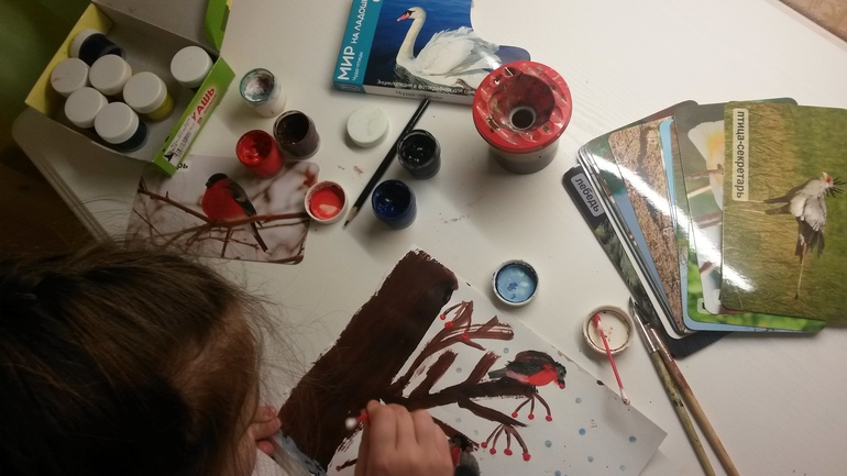 снегири выедают из ягод семена, а мякоть выбрасывают? Все это рассказала мне моя дочка, прочитала свою любимую энциклопедию в фотографиях от Компании . Очень много интересных тем собрано в этих замечательных чемоданчиках, все факты написаны доступным языком, только все самое интересное. Начитавшись про птиц, решили немного порисовать. Изобразили снегирей на рябиновой ветке, получилось хорошо. Вот и подарок для любимой бабушки готов. Главное поймать вдохновение, тогда все будет отлично. Всех с наступающим Новым годом, пусть мечты сбываются!