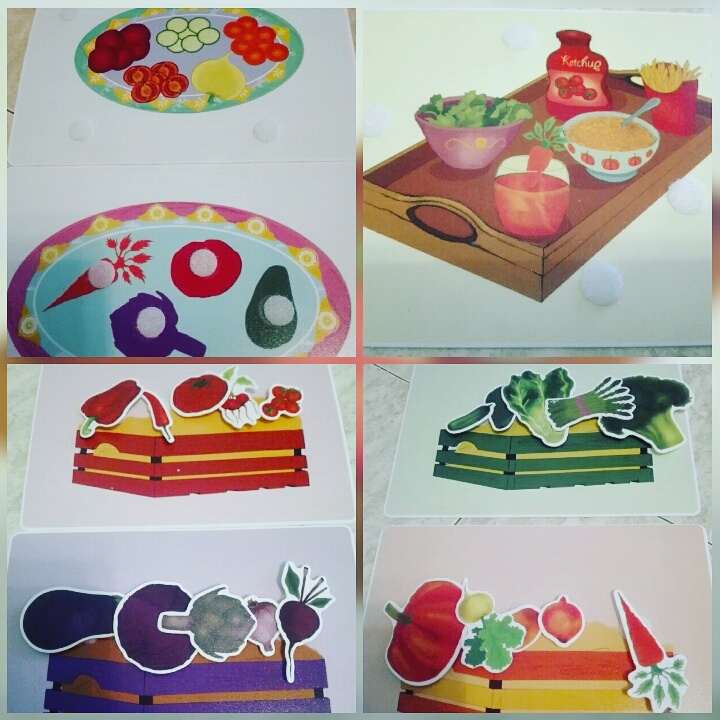 На одном блюде изображены силуэты,ребенок прикрепляет на игровое поле соответствующий овощ.На втором поле изображены овощи в нарезаном виде,ребенок должен закрепить на блюде тот овощ,из которого сделана нарезка. Третье поле представляет собой поднос,на котором стоят блюда,необходимо найти и закрепить на поле овощи,из которых это приготовлено. Для нас последнее задание самое сложное,но сын с большим интересом играет.