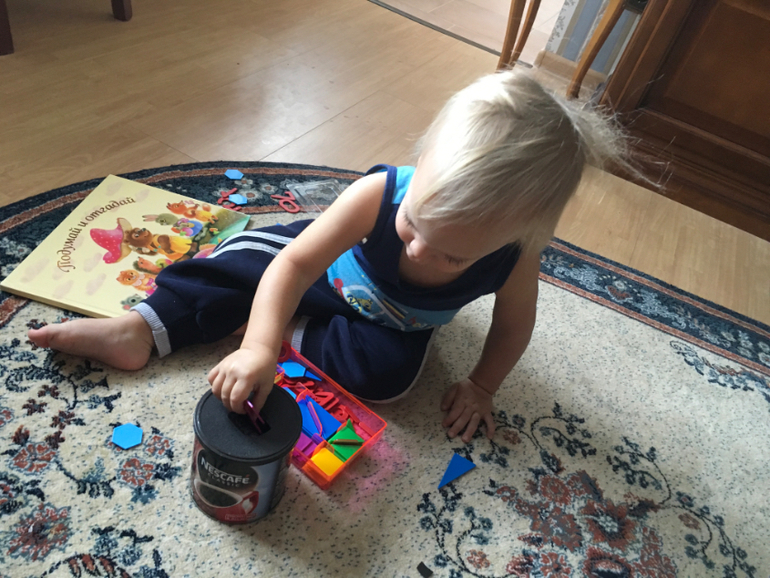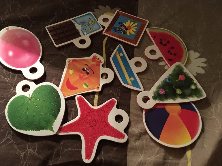 А формы решила такие попробовать в этот раз. Они вытаскиваются как вкладыши , в них дырочки, хочу разрядить Елку и какое-то время эти вкладыши подержать, пока не надоест ну и задания разные буду дававать, типа принеси трапецию -кораблик и т.д. Ещё эффективно на стену плакат повесить и называть их или просто формы отдельно по дому разбросать. У нас ещё альбом был - но это на любителя.