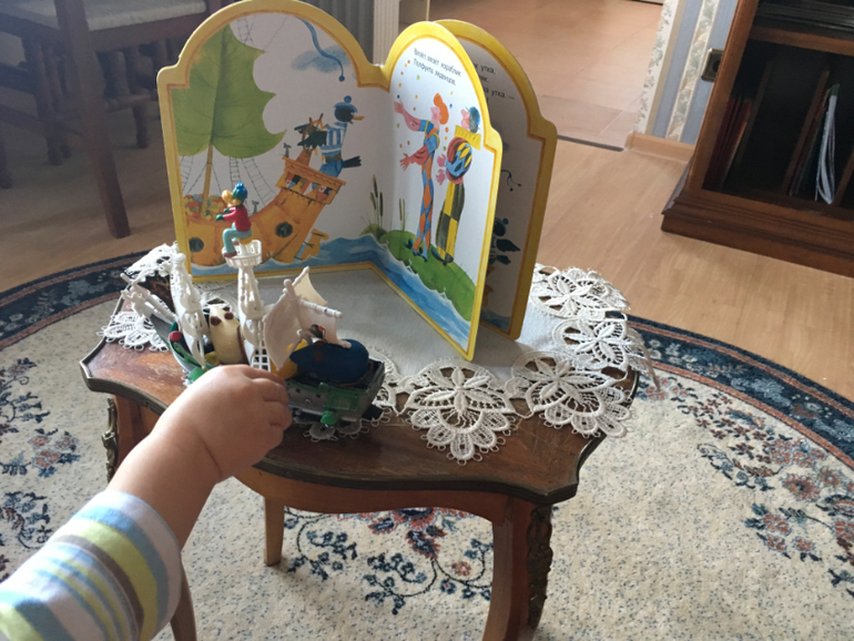 Нельзя не отметить резко выросший интерес к технике. Теперь вместо зарядки начинаем утро с игр с машинками. Полюбил карточки из Мира на ладошке на эту тему, особенно интересует задний фон, на котором не меньше всего интересного, чем спереди. Здесь состряпали прицеп по мотивам известной книги про грузовик и прицеп.
