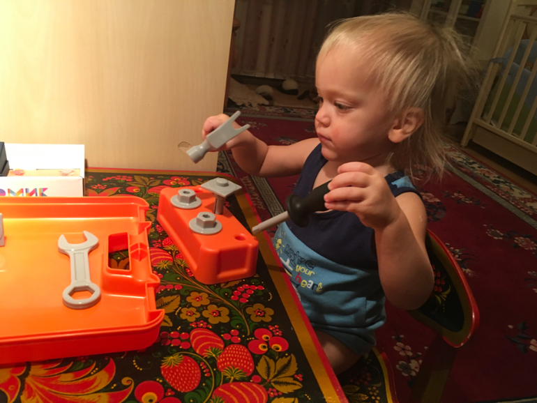 А это семейная реликвия, ей лет сорок-пятьдесят, если не больше. Извлекли ее с антресолей прабабушки и даже полувековая пыль - как иней.. не поднялась рука полностью счистить. Ну и игрушки были выданы Тимофею соответственные - небьющиеся, но при этом раритетные. Игрушки, в которых часть истории нашей семьи.. они прошли через маленькие пальчики бабушек, прабабабушек и, возможно, даже прапрабабушек...
