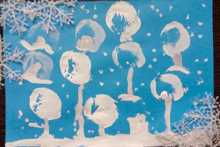 Саша штамповала картофелем, стволы пальчиками. а снег как всегда палочками))