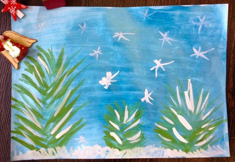 Фон Саша раскрасила акриловой краской с перламутром, елочки и снег рисовали вместе гуашью)