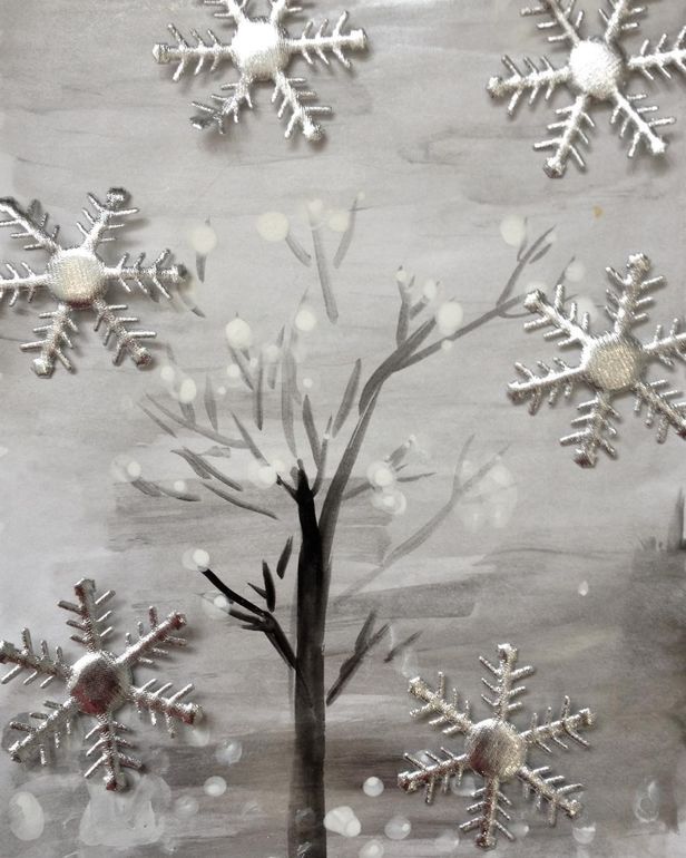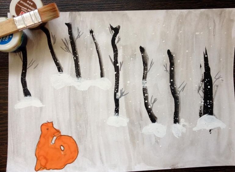 Картину рисовали- фон -гуашь смешали и закрасили лист. дерево совместное творчество, а снежок ватной палочкой штамповала дочка