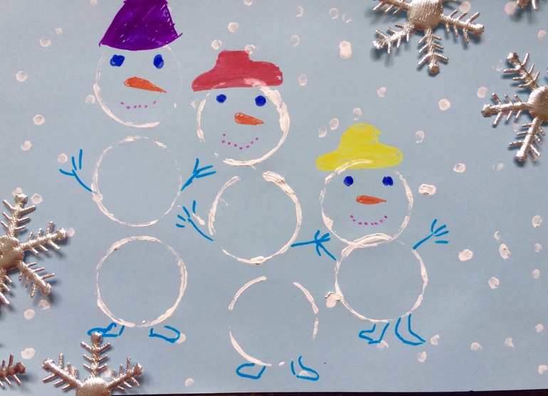 9.А это наша семья)) Саша так сказала)) рисовала втулкой и гуашью. а снег палочкой ватной. Дочке очень понравилось рисовать палочками) просила несколько раз просто потыкать))