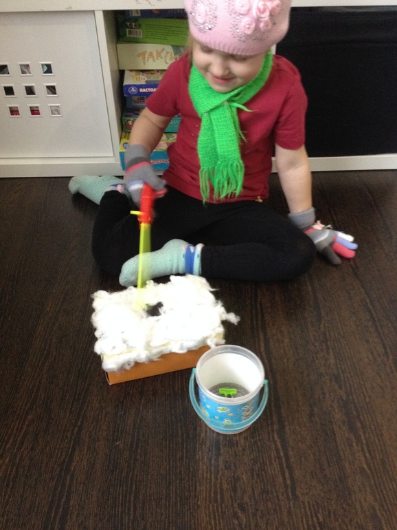 Как-то наш папа уехал на рыбалку, Саша его очень ждала, бесконца спрашивала когда приедит, что делает- вот мне в голову и пришла идея-зимняя рыбалка дома)) А рыбки у нас не простые-это магнитные циферки. поймала "рыбку"-назови цифру)