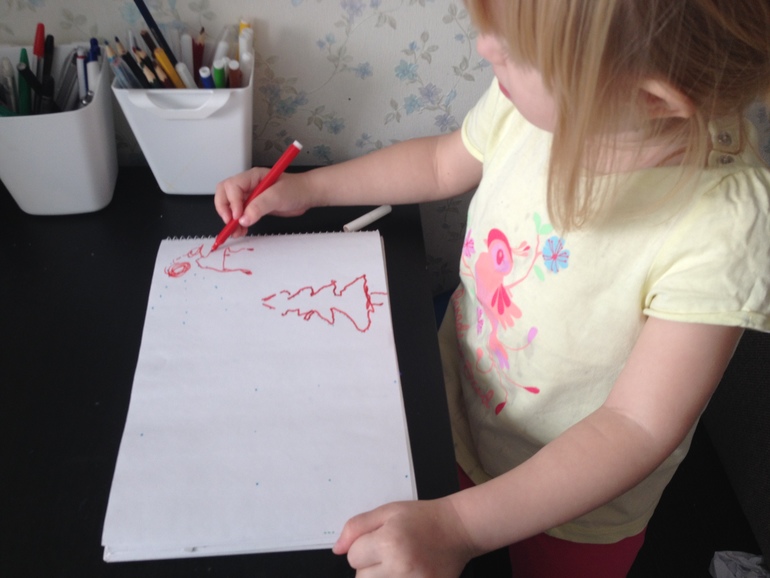 я заранее точками нарисовала картинку, а задача дочки-обвести по точечкам- получилось . но дочка дополнила картину))