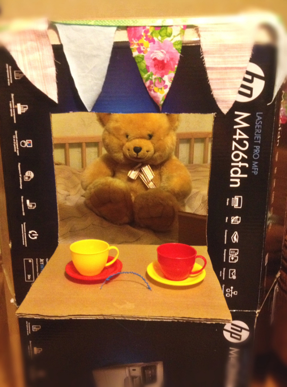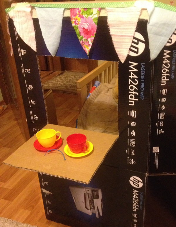 Из огромной коробки сделала киоск, с откидной крышкой. Ее можно захлопывать, если начался обеденный перерыв)) Играли, будто это билетная касса, потом это был книжный магазин, потом вообще ремонтная мастерская. Я об эту штуку регулярно запинаюсь, все хочу выбросить, надоела до ужаса, а Ванька не дает.