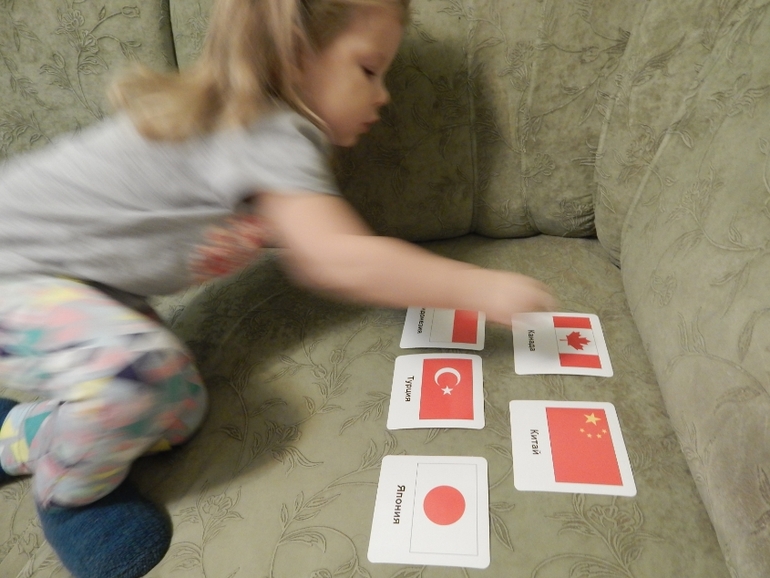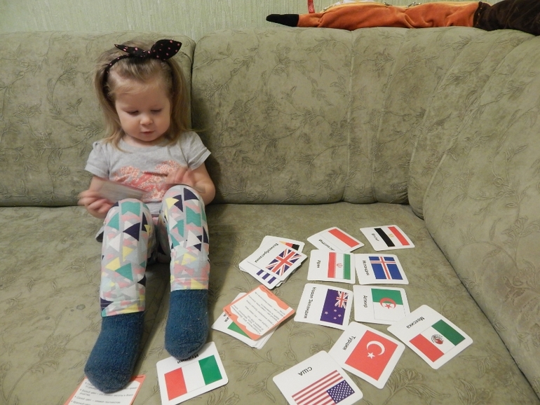 Перед сном я спросила у Славы, какие страны она теперь знает и дочь без подсказок (но слегка изковеркано) назвала 6 стран. На мой взгляд, хорошее начало))