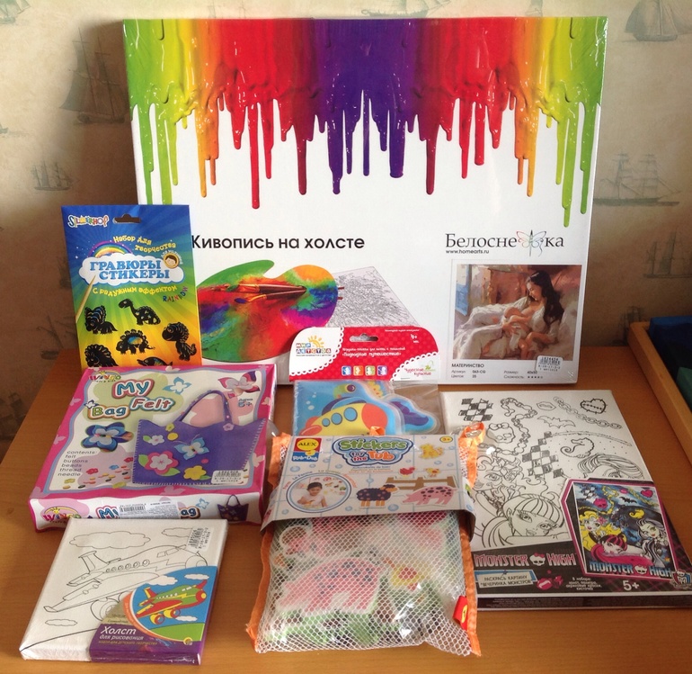 Для нас троих мне и старшим деткам холсты для раскрашивания! (Про мою ляпоту-красоту-мечту отдельно расскажу:)) и еще деткам: сумочка - правда решили что Софии ее чуть позже сошьет для сестренки:) а Лео наклейки гравюра!