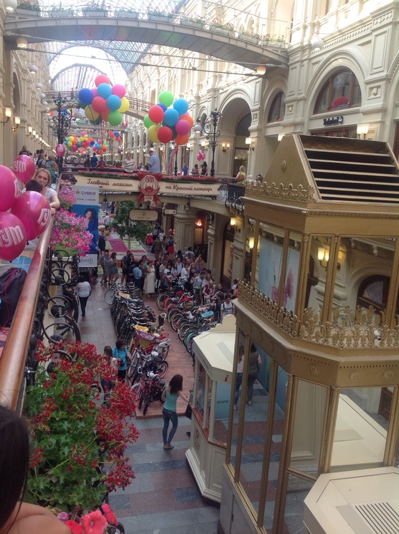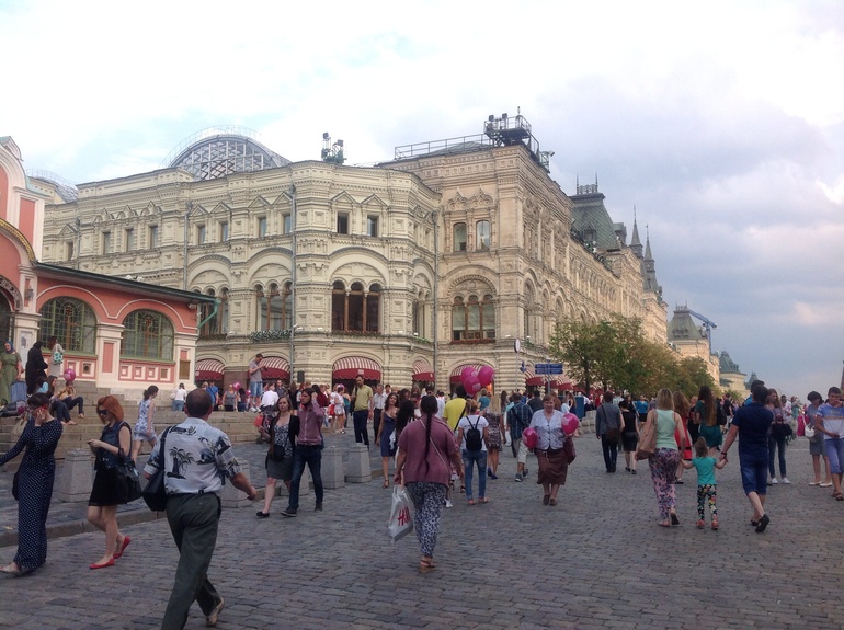 Не смотря на будний день, на красной площади было очень многолюдно:)) основная масса текла в/из ГУМа:) бабуличка по центру с двумя шариками, приблизившись, отдала их нам:))