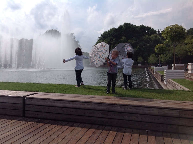 Время от времени появлялось солнышко, дождик больше не моросил, но нас обрызгало фонтаном! Дети были очень даже довольны!