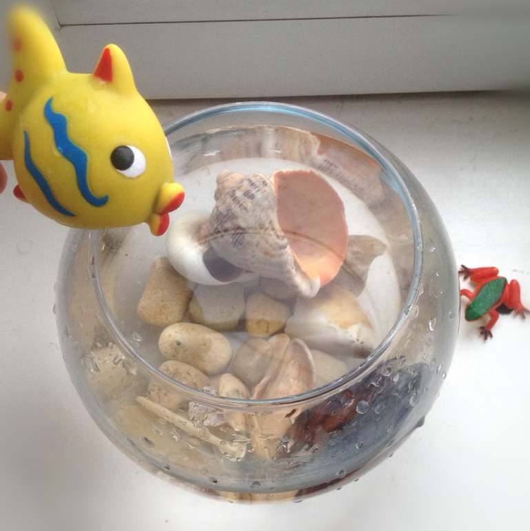 Решили сделать свой аквариум. Дала вазочку, ракушки, камушки, рыбок, лягушек. Налила теплой воды - и это на полчаса! Тима долго вычерпывал всех обитателей аквариума в тарелку и обратно))