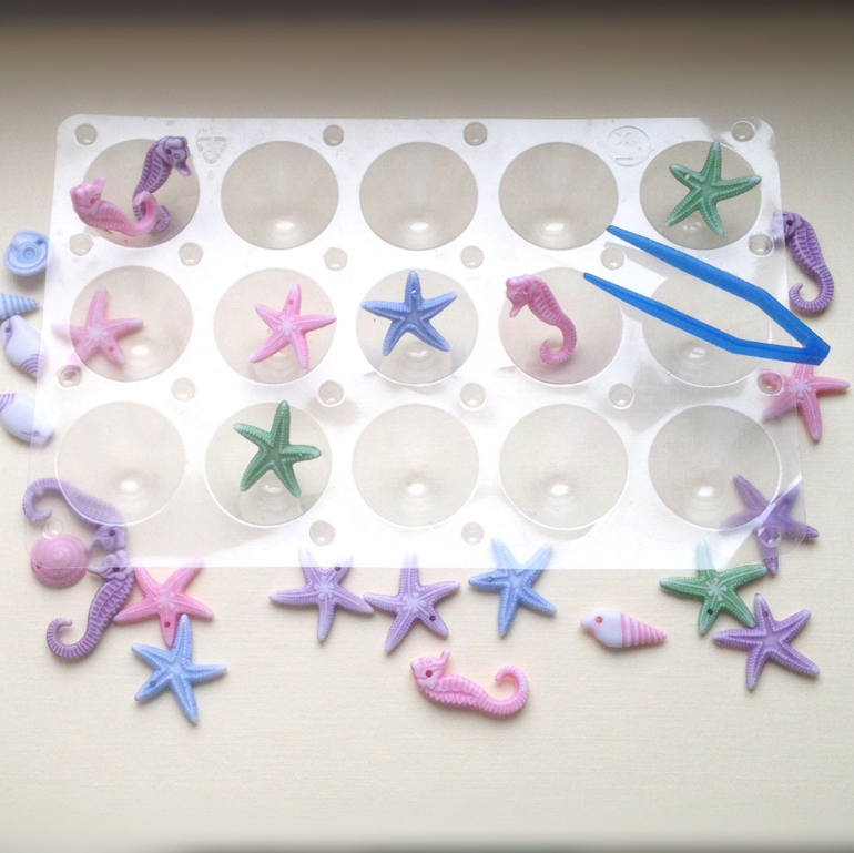 Разложили пинцетом морских звезд по ячейкам. Пинцетом работать Тимошка ленится. Несколько штучек разложит, остальное руками. Фигурки покупала в фикс прайсе.