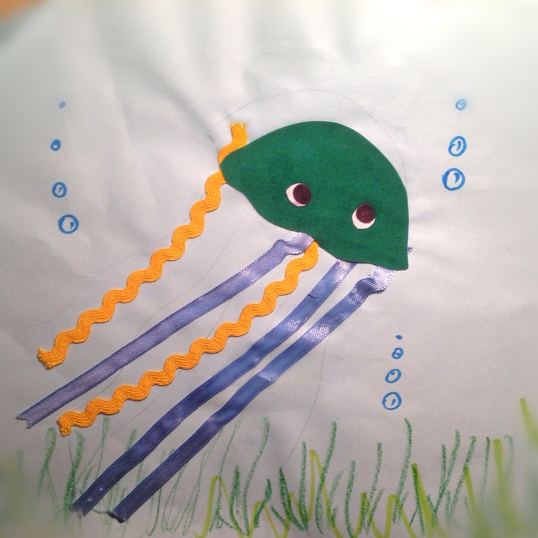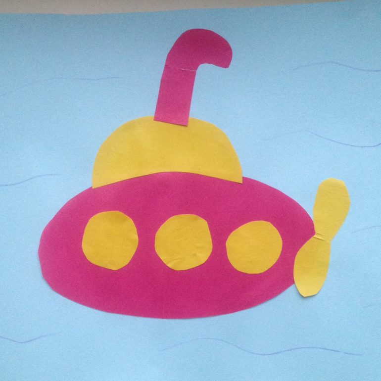 Потом играли в подводную лодку и заодно сделали аппликацию. Делал все сам. Мне кажется у него неплохо получилось. Аппликации мы делаем из нескольких деталей, чтоб ребенок сам учился сопоставлять недостающие части, комбинировать.