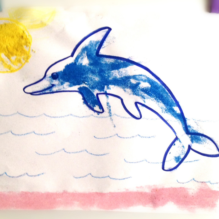 Смотрели картинки с дельфинами, я рассказывала про этих удивительных животных, какие они умные, как разговаривают. И раскрасили дельфинчика цветным песком.