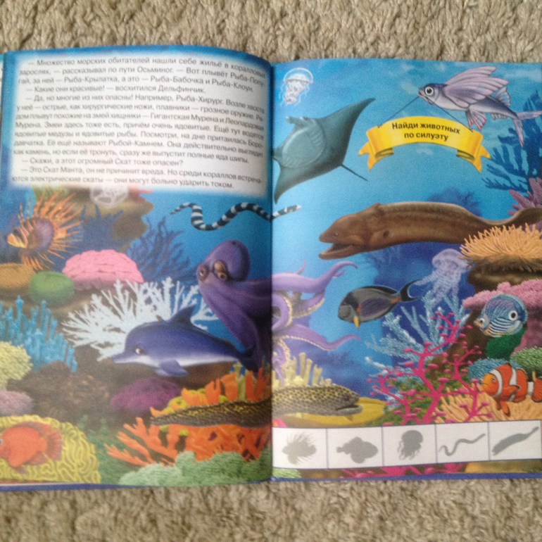 Читали книжку про дельфинчика. Очень познавательная книжка. Плюс на каждой страничке рыба дает задание)) Благодаря этой книжке даже я впервые узнала про существование многих рыб)) Я и не представляли как выглядит стерлядь или белуга.