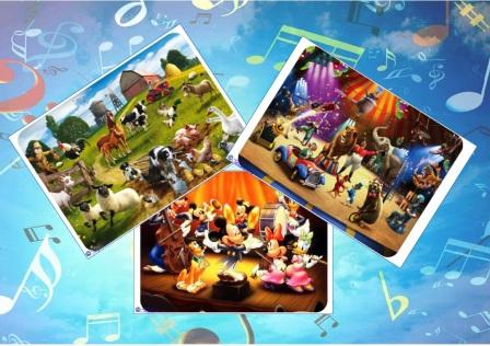 5. В конце игрового комплекта предоставлены сюжетные картинки. Задача ребёнка - не просто отгадать, к чему относится услышанный звук, но и отыскать его на картинке. Игра усложняется ещё и тем, что объектов, издающих один звук, может быть несколько. Например, на картинке «Цирк» встречается несколько обезьян. С сюжетными картинками может играть неограниченное количество игроков.