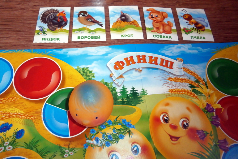 Финишная клетка трехцветная, поэтому на нее можно прийти, выбросив на кубике любой цвет. Придя на финиш, игрок должен спеть победную песенку своего колобка, перечислив всех героев, которых встретил на своем пути, одновременно переворачивая карточки картинкой вверх, и закончить так: "Я не попаду в беду - от любого я уйду!".